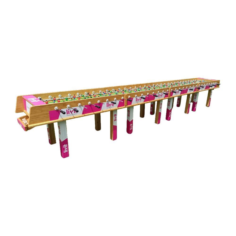 El futbolín gigante permite jugar entre 8 y 16 jugadores, con la posibilidad de ampliar su capacidad: